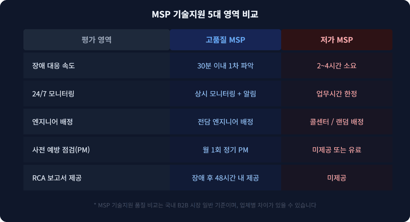 같은 "MSP 기술지원"이라는 이름 아래, 실제 서비스 내용은 업체마다 크게 다릅니다. MSP 선택 전에 반드시 비교해야 할 5가지 영역을 정리합니다.