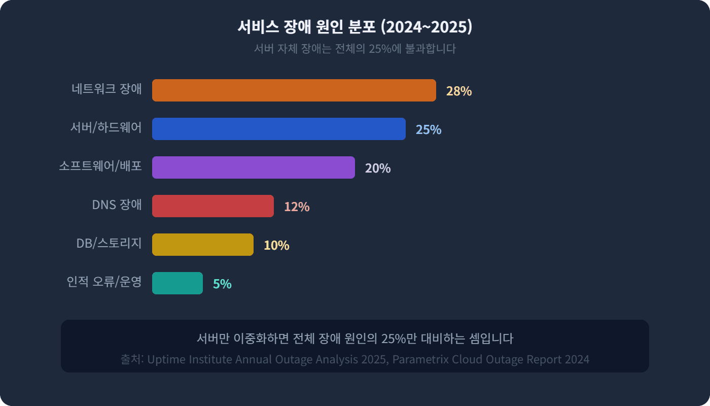데이터가 보여주듯, 서버 하드웨어 자체의 장애는 전체 서비스 중단 원인의 약 25%에 불과합니다. 나머지 75%는 네트워크, DNS, 소프트웨어, DB 등 서버 외부의 요인입니다. 서버 이중화만으로는 전체 장애의 4분의 1밖에 대비하지 못하는 셈이죠.